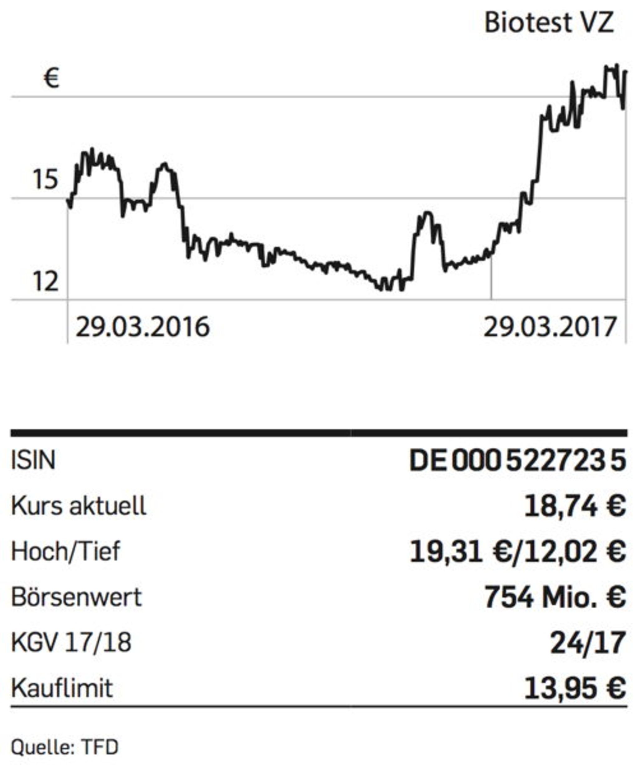 tiv – zumal sich Biotest in den fortgeführten Kernbereichen, also dem Therapiegeschäft und der Plasmafraktionierung außerhalb der USA sowie der Plasmasammlung in den USA und Europa, 2016 deutlich verbessert hat. Zudem führt Biotest derzeit Verhandlungen mit Creat Group Corporation, einer führenden chinesischen Investmentgruppe, über einen möglichen Zusammenschluss der beiden Unternehmen. Kurzum: Es ist wieder Musik in der Aktie. Risikobereite Anleger steigen ein.