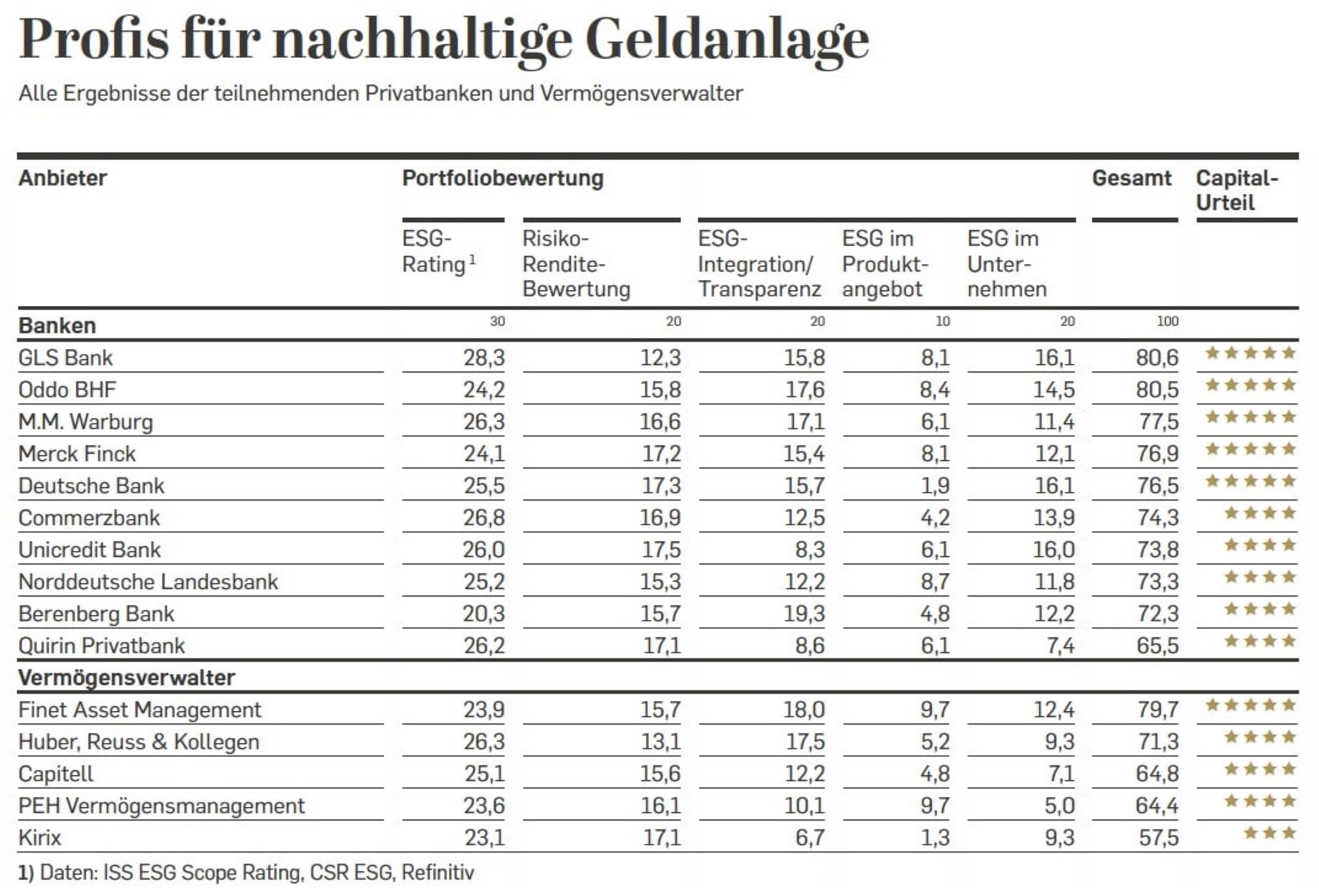 Die genossenschaftliche GLS Bank und die deutsch-französische Privatbank Oddo BHF arbeiten in der privaten Vermögensverwaltung für besonders wohlhabende Kunden mit den überzeugendsten Nachhaltigkeitskonzepten. Dies ist das Ergebnis der ersten gemeinsamen Studie zu dem Thema durch Capital und den Münchner Analyse- und Beratungshäusern Institut für Vermögensaufbau (IVA) und Tetralog (Ausgabe 06/2021, EVT 20. Mai 2021). Ebenfalls auf die vordersten Ränge der Untersuchung schafften es die Hamburger Privatbank Warburg, die Privatbank Merck Finck und die Deutsche Bank.