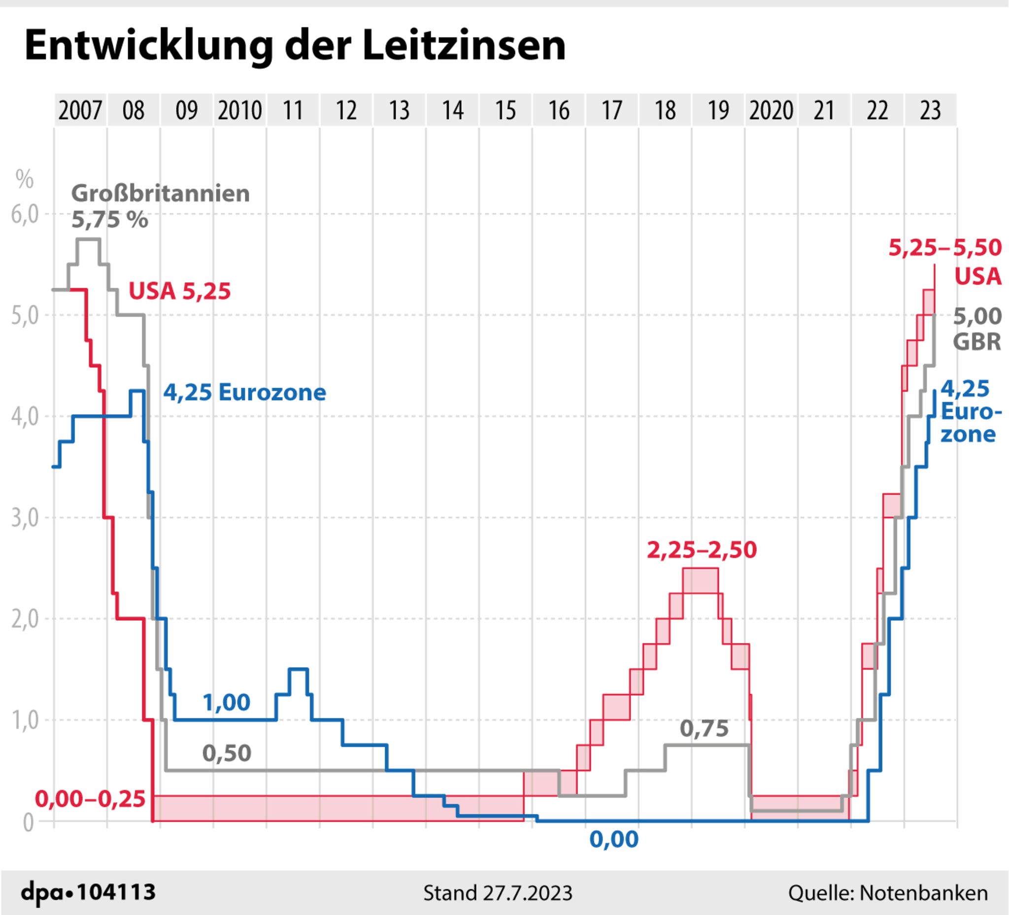 Zumindest mit einer Pause rechnet jedenfalls Michael Heise, Chefökonom von HQ Trust. „Differenzen dürfte es bei der Frage geben, inwieweit die bisherigen Zinssteigerungen – die ja mit zeitlicher Verzögerung wirken – die Konjunktur und damit auch den Inflationsdruck auf Sicht dämpfen werden“, sagte er. „Eine harte Landung der Wirtschaft mit deutlichen Einkommensverlusten zeichnet sich zwar noch nicht ab, aber die Konjunktur ist erkennbar angeschlagen. Daher dürfte im September eine Zinspause eingelegt werden.“