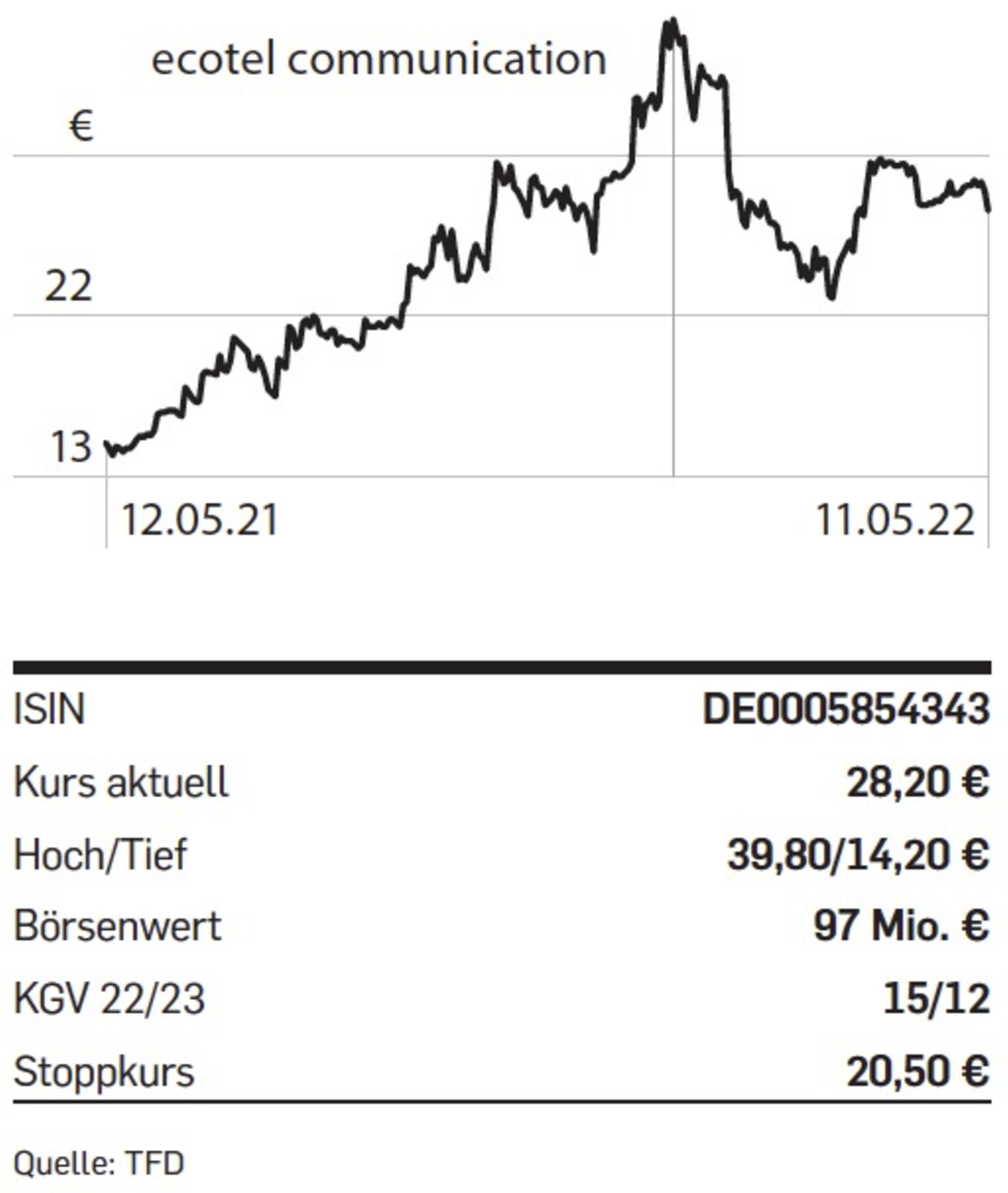 In diesen unruhigen Zeiten kann es nicht schaden, Ausschau nach defensiven Titeln zu halten. Ecotel Communication erfüllt diese Prämisse. Der Vermarkter von Informations- und Telekomlösungen hat soeben einen starken Zahlenkranz vorgelegt. Im ersten Quartal kletterten die Erlöse um ein Drittel auf 27,2 Mio. Euro und damit deutlich stärker als erwartet. Der Überschuss verbesserte sich sogar um 45 Prozent auf 1,3 Mio. Euro.