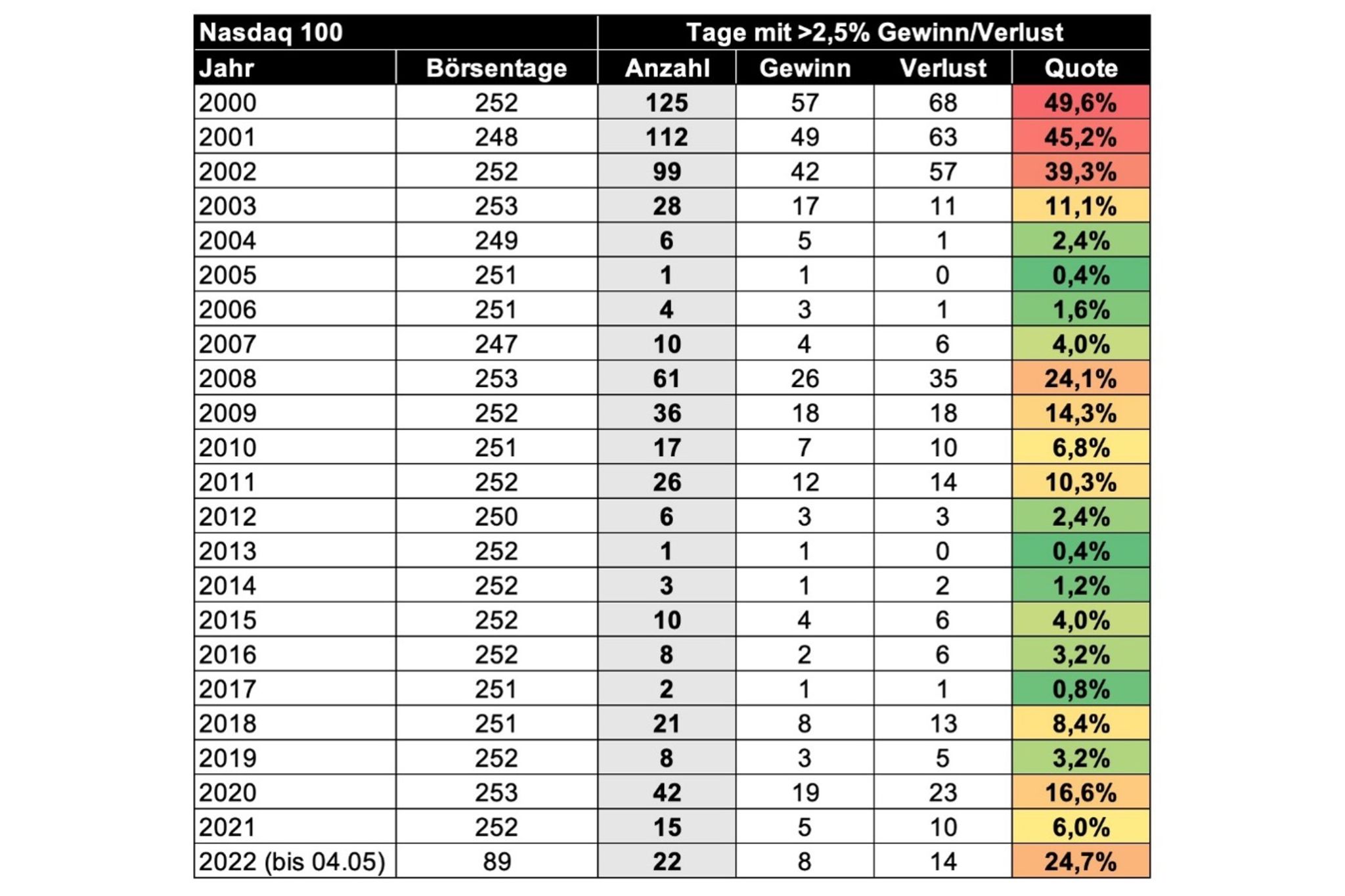 Die große Unsicherheit wird sichtbar anhand der Tagesschwankungen. Im Nasdaq 100 etwa erlebten wir in diesem Jahr an bislang 21 von 87 Börsentagen Schwankungen gegenüber dem Vortag von mehr als 2,5 Prozent (siehe Grafik). „Das ist ein klares Stresssymptom“, sagte Röhl. Übrigens: Sowohl die 25 besten (+6,6 Prozent bis +18,8 Prozent) als auch die 25 schlechtesten Tage dieses Jahrtausends (-6,5 Porzent bis -12,2 Prozent) stammen aus den Krisenjahren 2000-02, 2008-09 und 2020. „Die Quote der Stresstage erinnert an diese Zeit“; so Röhl.