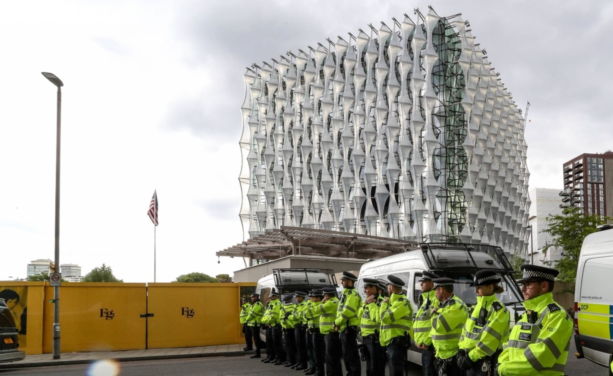 Streng genommen kein Turm, aber das zehntteuerste Bürogebäude der Welt: Vor der neuen US-Botschaft am Südufer der Londoner Themse wird häufig demonstriert – mit entsprechendem Polizeiaufgebot. Der von Architekt Kieran Timberlake entworfene Bau entstand 2013-18 und kostete etwa 1 Mrd. Dollar. Er unterscheidet sich im Design stark von dem Festungscharakter vieler anderer US-Vertretungen. Doch der Kubus ist aus 15 Zentimeter dickem Hochsicherheitsglas und hält potenzielle Eindringlinge durch einen Teich, stahlbewehrte Hecken und Böschungen fern.