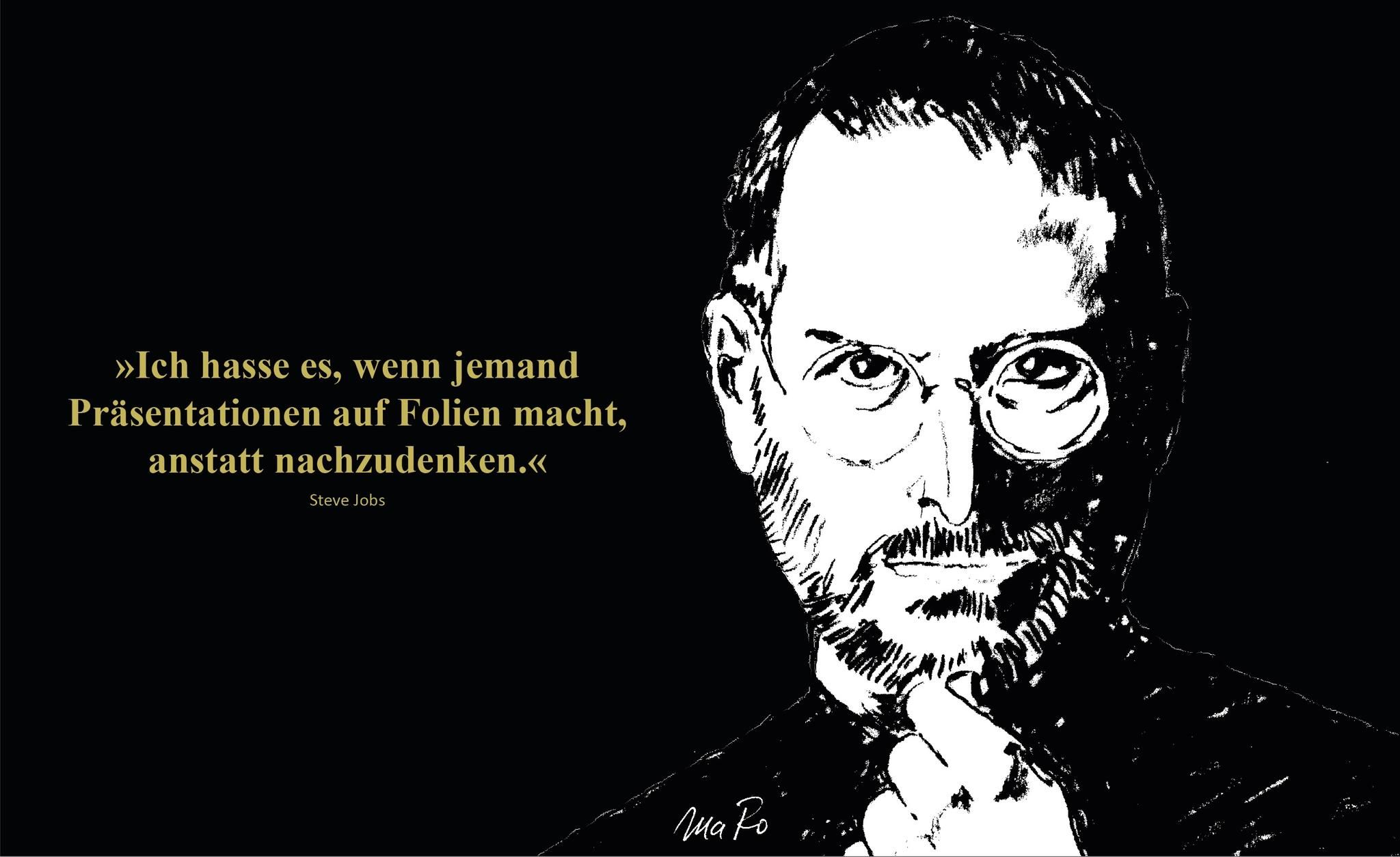 Steve Jobs verachtete den Einsatz von Folien bei Vorträgen und ließ daran nie einen Zweifel aufkommen: „Ich hasse es, wenn jemand Präsentationen auf Folien macht, anstatt nachzudenken. Menschen, die wissen, worüber sie reden, brauchen kein Powerpoint.“ Damit hatte Jobs ein elementares Problem angesprochen. Die meisten Businesspräsentationen werden als nicht überzeugend und zielführend wahrgenommen. Dabei sind langweilige Powerpoint-Präsentationen kein deutsches Problem. Sie sind eine globale Seuche.