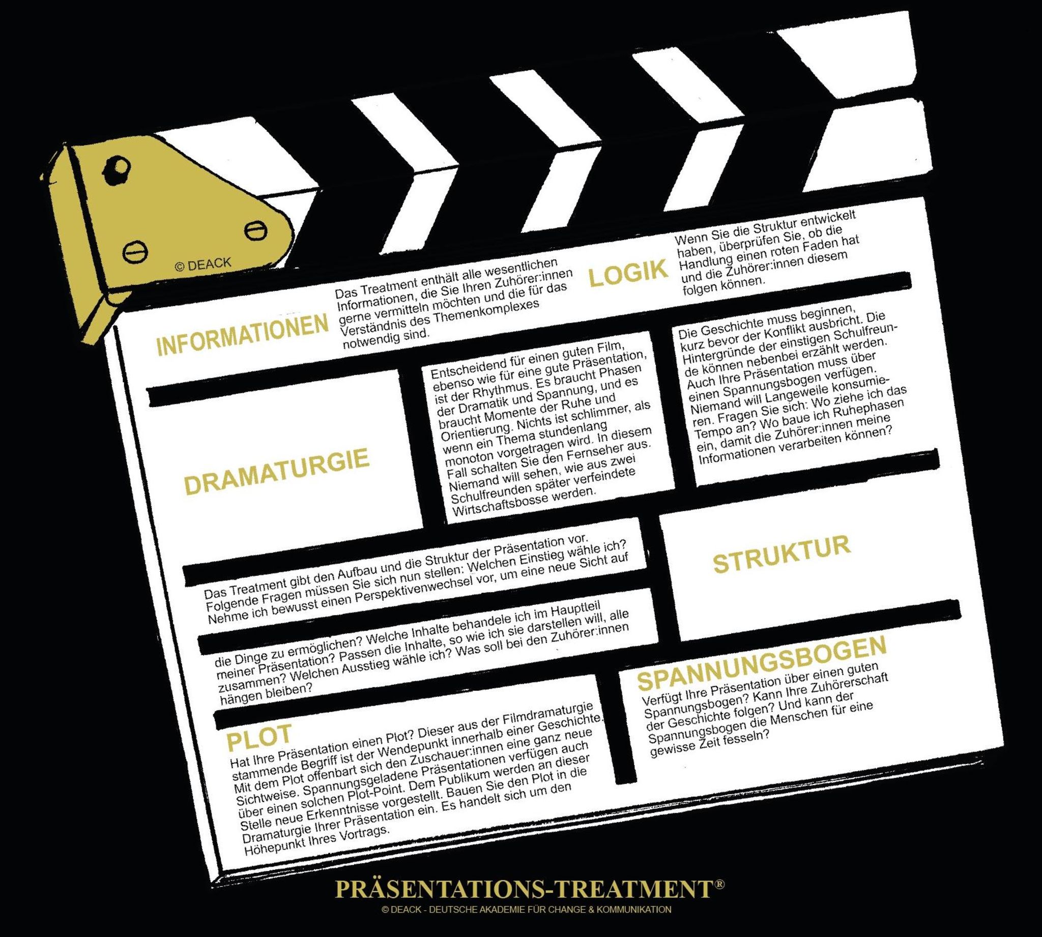 Ziel ist es, Bilder in den Köpfen der Zuhörer:innen zu verankern. Um all das zu erreichen, orientieren wir uns an dem Treatment der Filmindustrie. Das Treatment ist in der Filmbranche die Vorstufe zum Drehbuch. Anhand des Treatments wird entschieden, ob in ein Drehbuch und später in die Umsetzung des Films investiert wird. Die Treatment-Technik kann die Voraussetzung für eine gelungene Präsentation schaffen. Sie bietet Ihnen die Möglichkeit, aus einer Präsentation eine zusammenhängende Geschichte zu entwickeln. Das Treatment vor Ihrer Präsentation sollte die vollständige und dramaturgisch schlüssige Geschichte, die Sie erzählen wollen, vermitteln, ohne sich in der Tiefe der Details zu verlieren.