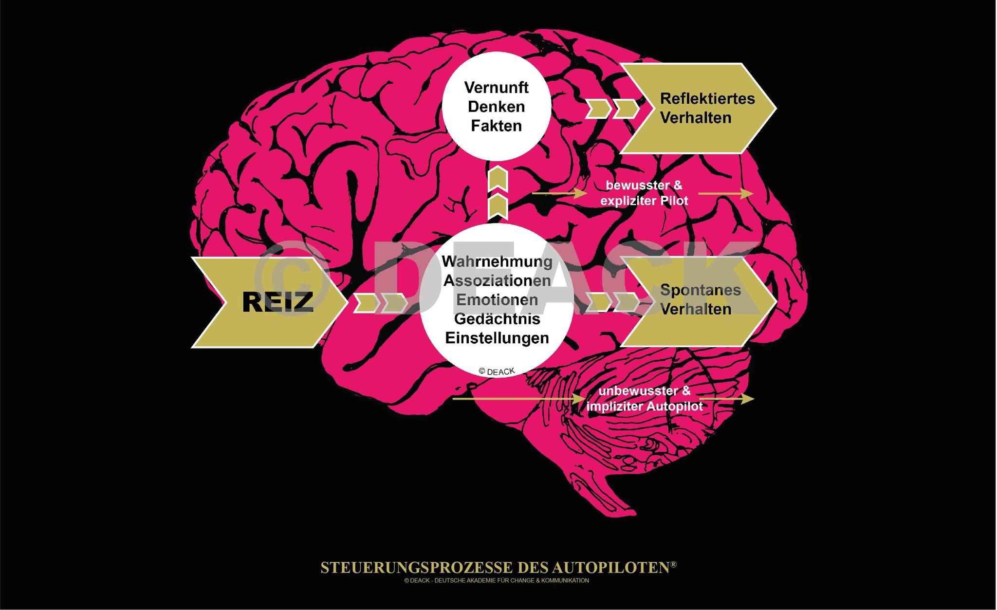 Grundsätzlich verfügen wir über zwei unterschiedliche Herangehensweisen in unserem Gehirn. Das erste System wird als Autopilot bezeichnet, das zweite als Pilot. Der Autopilot arbeitet in unserem Kopf mit hoher Effizienz: Er ist spontan, intuitiv und trifft sehr schnelle Entscheidungen. Hierbei arbeitet der Autopilot in unserem Unterbewusstsein und lässt sich stark von Emotionen, Motiven und kognitiven Prozessen beeinflussen. Diese kognitiven Prozesse werden auch als subtile Codes bezeichnet, da zu ihnen Automatismen, Assoziationen und Erlerntes sowie Erinnertes zählen, welche abgerufen werden. Hierzu zählen auch Werbe- und Markenbotschaften, die wir verinnerlicht haben. Der Autopilot greift auf diese automatisierten Programme zurück, die unser Handeln unbewusst beeinflussen. Innerhalb von Bruchteilen von Sekunden trifft er Entscheidungen für uns. Damit werden wir entlastet. Unsere Wahrnehmungskanäle werden mit über elf Millionen Bits pro Sekunde an Informationen bombardiert, von denen wir aber nur 20 bis 40 Bits bewusst verarbeiten können. Mit all den anderen Bits an Informationen ist unser Bewusstsein schlichtweg überfordert. Das heißt, dass fast 100 Prozent der Daten, die unser Gehirn aufnimmt, unbewusst verarbeitet werden. Somit werden wir mehr von unseren impliziten Codes als von einer gründlichen Kosten-Nutzen-Abwägung gesteuert.