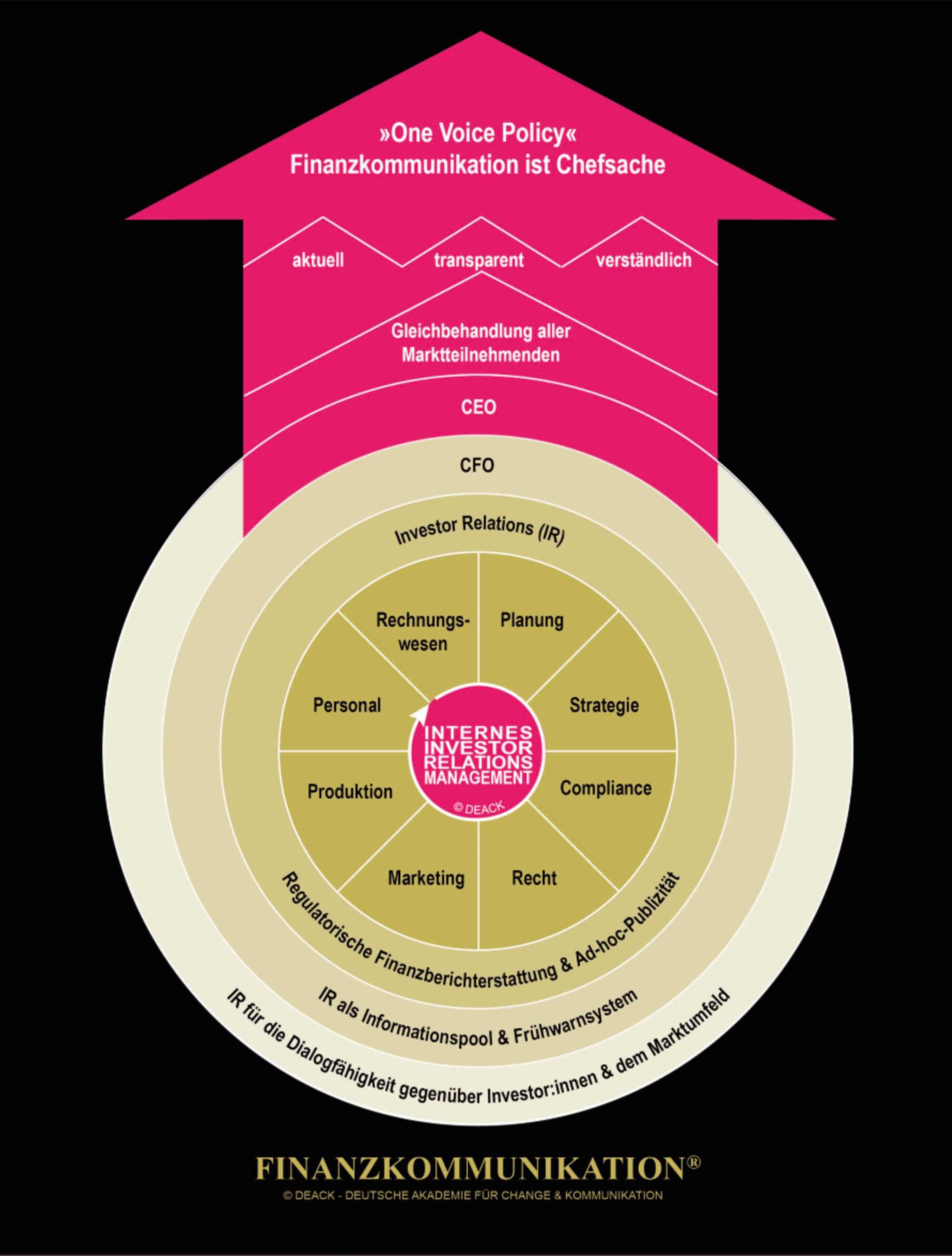 Damit kommt der Finanzkommunikation, die auch als Investor Relations (IR) bezeichnet wird, eine zentrale Rolle in Großorganisationen und Konzernen zu. Investor Relations haben die Aufgabe, die Finanzdaten, aber auch alle relevanten Informationen, welche die Finanzsituation eines Unternehmens mittelbar oder unmittelbar beeinflussen können, für die unterschiedlichen Anspruchsgruppen der Financial Community aufzubereiten. Die Kommunikation folgt zunehmend juristischen Vorgaben. Neben den gesetzlichen Pflichtveröffentlichungen hat die IR für Transparenz zu sorgen. Wichtige Richtlinien sind hierbei: Kapitalmarktorientierung, Wesentlichkeit, Nachvollziehbarkeit, Aktualität, Kontinuität und die Gleichbehandlung aller Marktteilnehmer:innen. Dazu gehören auch Informationen über Unternehmensentwicklung und die daraus resultierenden Perspektiven.