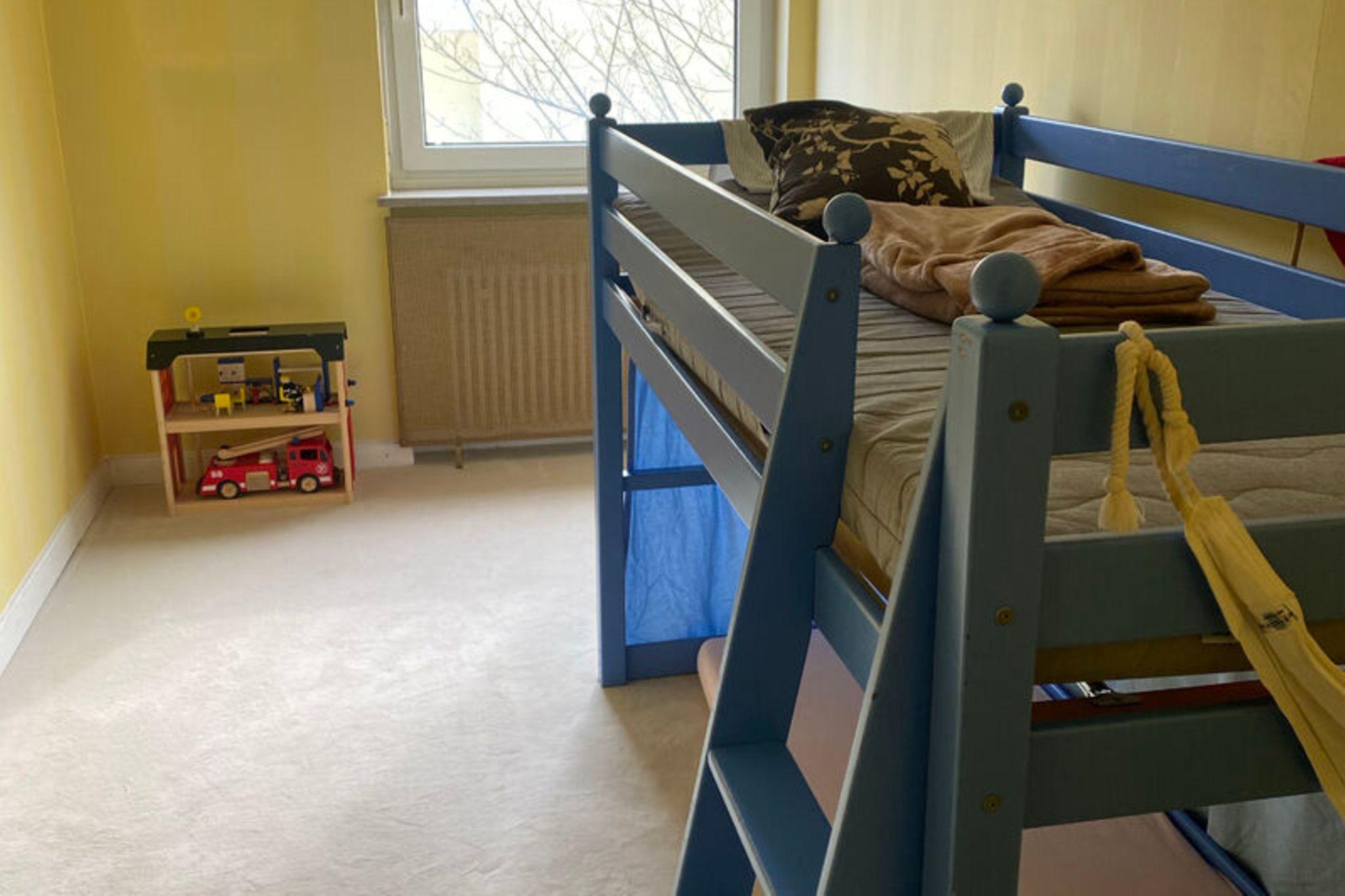 Rund 15 Personen waren da, die dann wirklich nahezu alles gebracht haben: Betten, Küchenutensilien, Sessel, Esstisch, Kinderstühle, Stühle, Handtücher, Putzzeug, Kinderspielsachen. Im Kinderzimmer: blaues Schiffshochbett mit gelber Wand - die Farben passen. Es fehlten noch Kochtöpfe und ein Staubsauger; diese Sachen haben ich dann noch in der Metro gekauft.