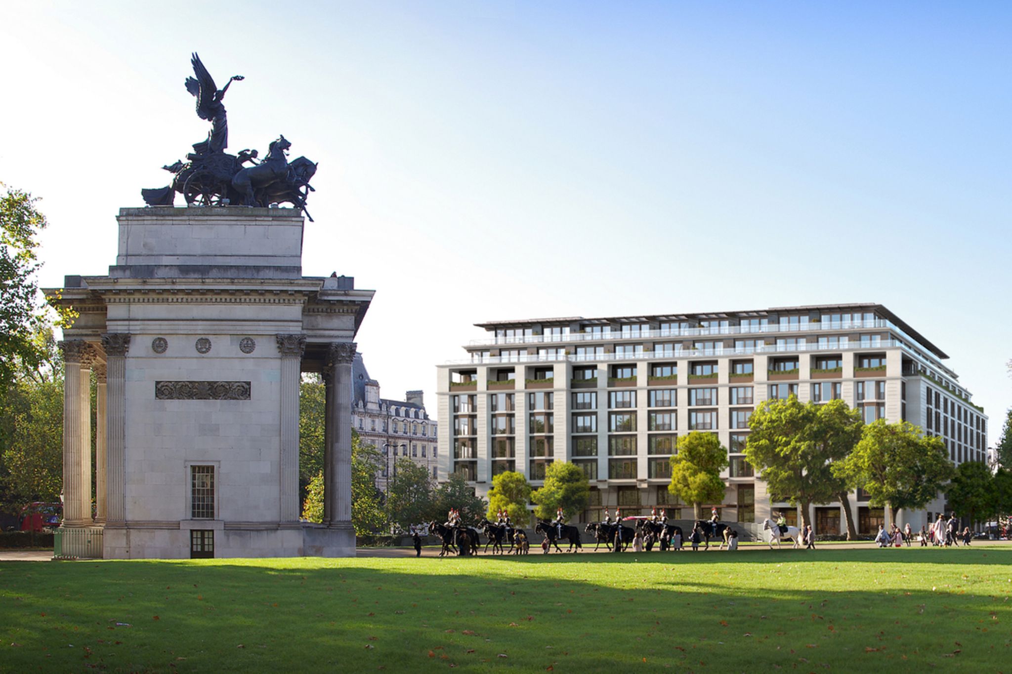 Auch sonst folgt man bei dem prunkvollen Projekt der niveauvollen Verquickung von Ost und West. Etwa mit zwei Löwen, die vom Haupteingang des neuen The Peninsula auf den Triumphbogen Wellington Arch blicken würden, wenn, ja, wenn ihre Augen nicht noch abgedeckt wären. Der Grund: Ihre Energie soll bewahrt werden, für den Schutz des 800 Mio. Pfund teuren Hauses und seiner Gäste.