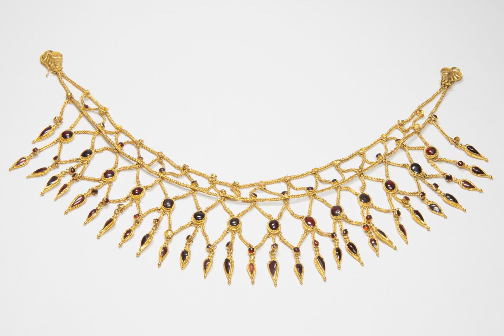 Man erkennt noch heute das Handwerk, das dem Schmuckstück einst seine Form gegeben hat: einige Unregelmäßigkeiten hier und da an den kleinen, feinen Kettengliedern, auch die winzigen Unebenheiten in den Einfassungen der roten Granatsteine. Die Spuren zeugen von der Kraft der Werkzeuge, die damals gewirkt haben müssen, und vom Können der Goldschmiede, die sie in den Händen hielten. Weit mehr als 2000 Jahre ist das jetzt her, in der Gegend um das antike Myrina, nördlich von Smyrna, heute besser bekannt als die türkische Hafenmetropole Izmir.