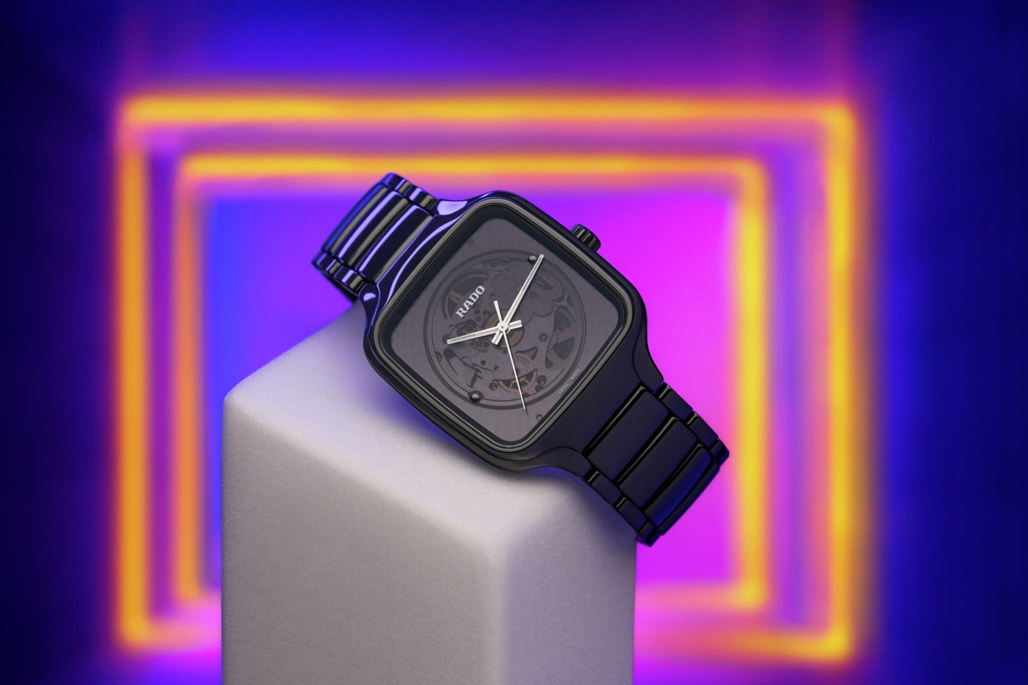 Dass diese kreative Vision Morinagas nicht nur auf der Bühne sondern auch im Miniformat begeistert, beweist er jetzt mit einem Projekt für und mit Rado. Die zweite Zusammenarbeit übrigens, denn bereits 2017 wagte sich der Avantgardist für die Marke in die Welt der Uhrmacherei. Das Modell „Rado True Square x Kunihiko Morinaga“ nimmt nun den reflektierenden Faden auf, der bereits Beyoncé und ihr Stylingteam begeistert hatte. In einem Monoblock- Gehäuse aus glänzend schwarzer Hightech-Keramik ist das Werk R734 verschalt, das bei UV-Licht fast komplett hinter dem eigentlich transparenten Zifferblatt verschwindet.