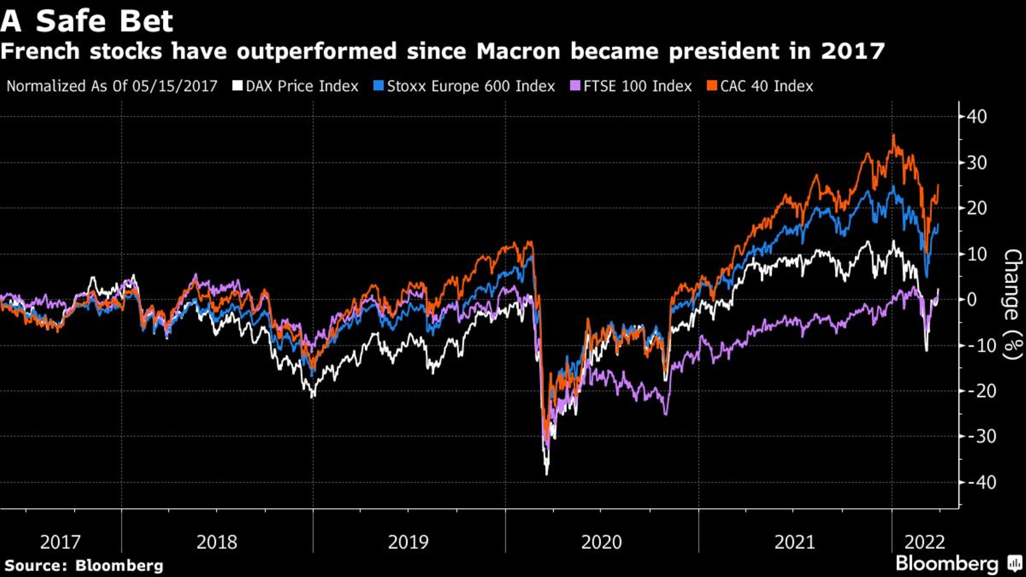 Der Aktienkurs des Bau- und Mautstraßenbetreibers Vinci brach ebenfalls ein. Le Pen hat versprochen, im Falle ihrer Wahl die Autobahnen wieder zu verstaatlichen. Während der Präsidentschaft des wirtschaftsfreundlichen Macron haben französische Aktien insgesamt eine bessere Performance gezeigt.