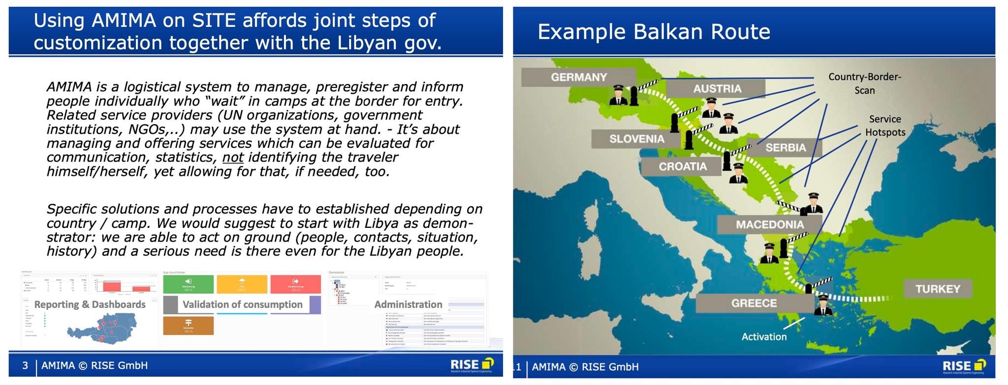 Nach Angaben von RISE handelte es sich bei dem AMIMA-Konzept um eine „interne Weiterentwicklung“ für ein Projekt des österreichischen Innenministeriums zur elektronischen Registrierung von Flüchtlingen namens Pre-ID, bei dem RISE Anfang 2016 nach Regierungsangaben für knapp 1 Mio. Euro als Dienstleister mitwirkte. Für welchen „befreundeten Politiker“ Marsalek das Konzept haben wollte, sei der Firma „nie bekannt“ gewesen. „Wirecard hatte Interesse, in Libyen eine Payment-Lösung zu etablieren“, erklärte die Sprecherin. „Für uns ging es um ein Projekt des ,Banking the Underbanked‘, das heißt die Ausstattung der Flüchtlinge mit bestimmten Ressourcen“ – was etwas seltsam klingt, wenn man die Präsentation liest: Darin geht es nämlich weniger um einen humanitären Ansatz, sondern viel um das Tracking von Personen, etwa bei Grenzübertritten. Das Wort „Kontrolle“ taucht mehrfach auf, die Worte Bank, Konto oder Payment nicht ein Mal. Auf das Konzept habe es „seitens Wirecard“ nie Reaktionen gegeben, erklärte RISE. Auch Marsaleks private Aktivitäten in Libyen „waren in keiner Weise bekannt“.