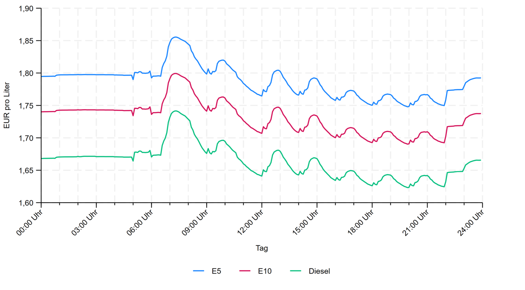 Eine Shell-Tankstelle in München hat an diesem Tag 32-mal den Preis geändert. Eine Bavaria-Petrol-Filiale und eine Esso-Station, ebenfalls in München, sogar 36-mal. Die Shell-Filiale zum Beispiel hat in den anderthalb Stunden nach acht Uhr den Super-E10-Preis alle 15 Minuten geändert. Dabei schwankte der Preis an diesem Tag insgesamt um 13, bei der Bavaria-Petrol um 14, bei Esso um 16 Cent pro Liter.