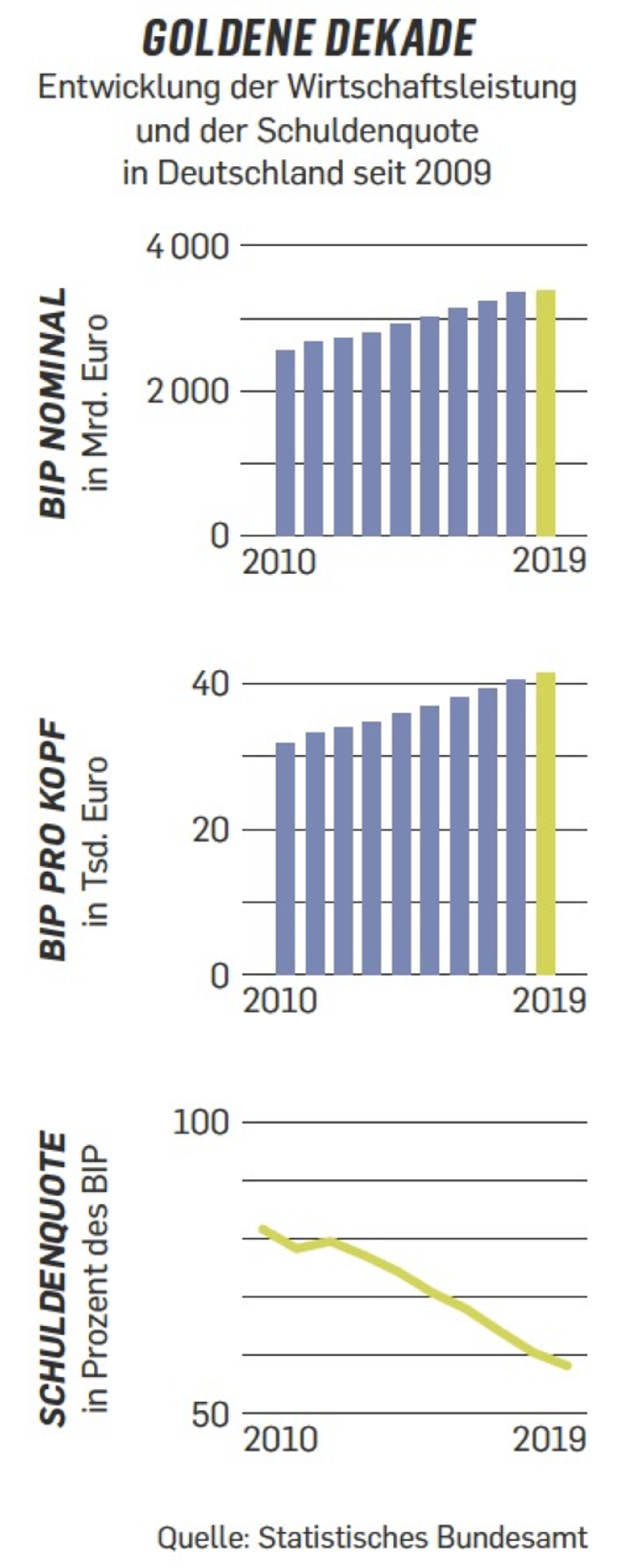An deren Anfang stand ein „V“, eine Kurve nach oben, nach dem historischen Einbruch 2009. Deutschland erholte sich, erlebte ein fulminantes Comeback, in dem die Volkswirtschaft um knapp eine Billion Euro auf rund 3,4 Billionen anschwoll. Das BIP pro Kopf wuchs von gut 30 000 Euro auf über 40 000 Euro, die Zahl der Erwerbstätigen von 41 auf 45 Millionen, die Löhne stiegen im Schnitt um ein Viertel.