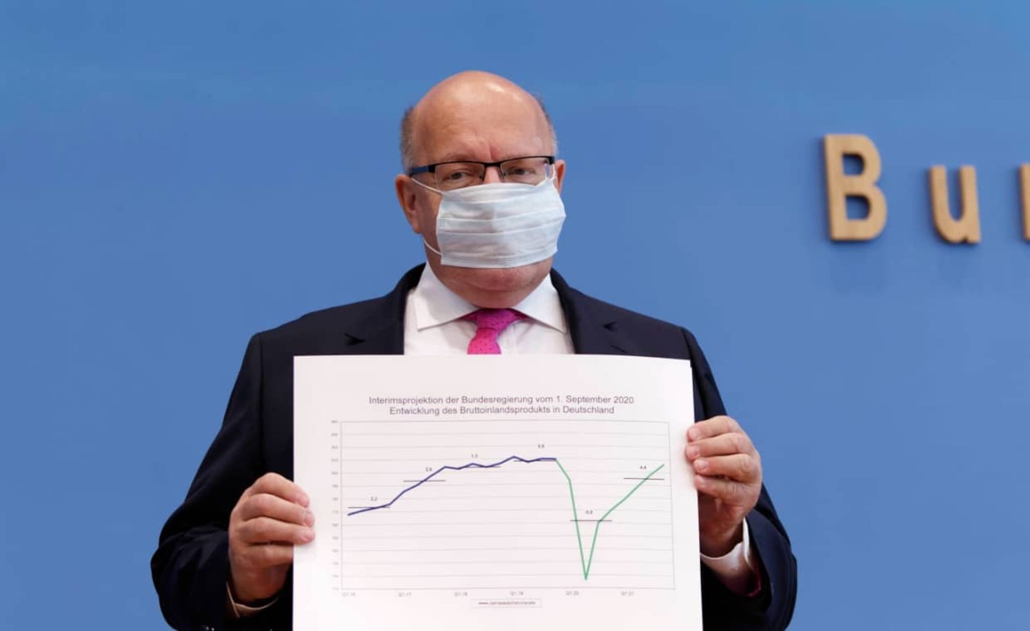 Eurostat lagen im August noch nicht Daten für alle Mitgliedsstaaten vor. In der vorläufigen Tabelle zum Bruttoinlandsprodukt von April bis Juni rangierte Deutschland auf Platz zehn der Länder mit dem stärksten Rückgang. Das deutsche BIP sank demnach im Vergleich zum zweiten Quartal 2019 um 11,7 Prozent. Im ersten Quartal 2020 hatte das Minus 2,2 Prozent betragen. Das Statistische Bundesamt meldete etwas andere Zahlen. Demnach verringerte sich das BIP preis- und kalenderbereinigt im Vorjahresvergleich um 11,3 Prozent. Das war der stärkste Rückgang seit Beginn der vierteljährlichen Berechnungen ab 1970. Der bisherige Rekordwert hatte nach der Finanzkrise im zweiten Quartal 2009 bei minus 7,9 Prozent gelegen. Wirtschaftsminister Peter Altmaier ist zuversichtlich, dass es nun wieder bergauf geht.