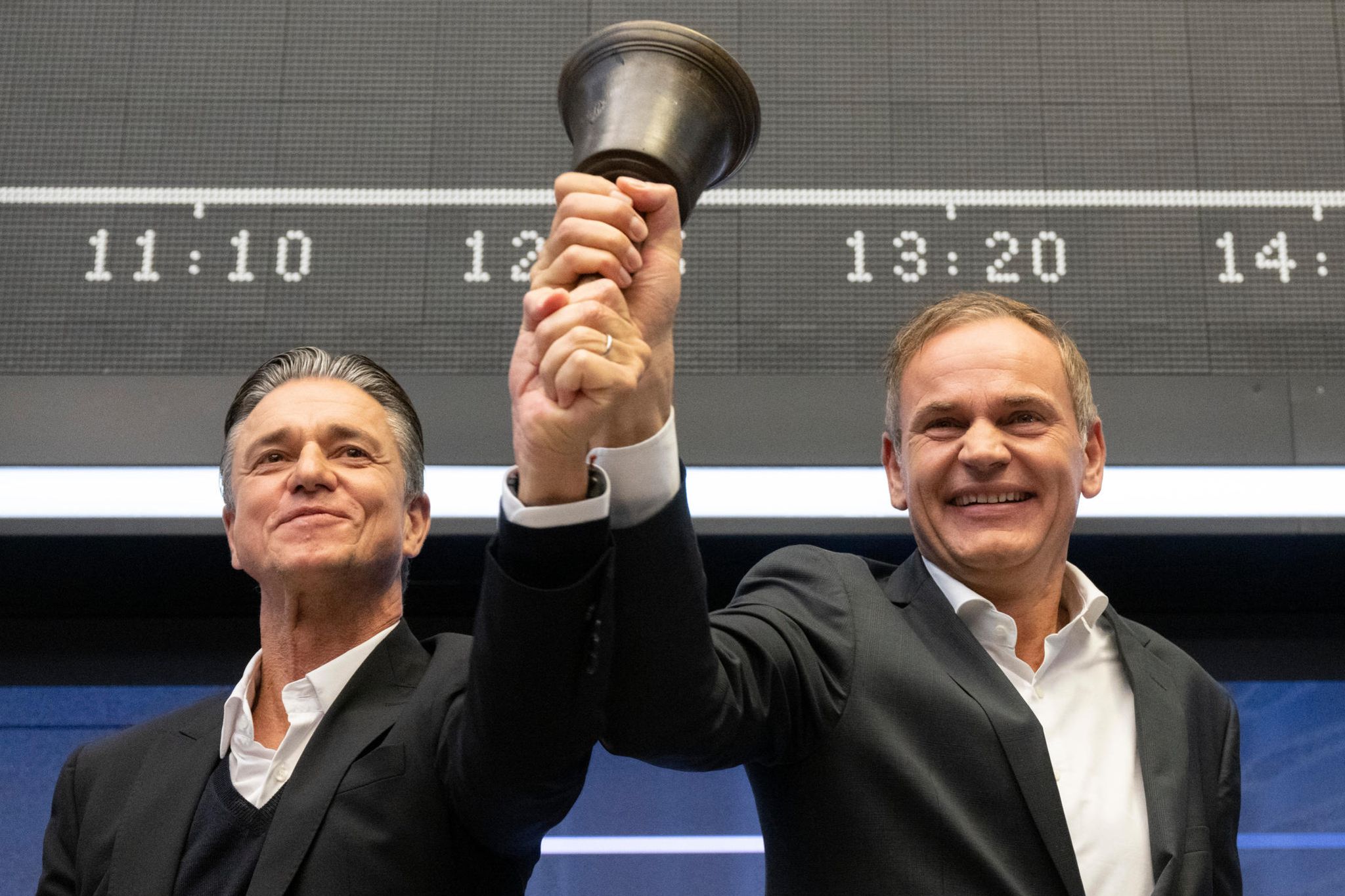 Der traditionelle Auftritt an der Börsenglocke: Oliver Blume und Finanzchef Lutz Meschke läuten erleichtert den Handel ein. Der Börsengang ist die größte Erstemission in Deutschland seit der Telekom im Jahr 1996 – und er verlief ordentlich. Knapp 9,4 Mrd. Euro wurden eingesammelt. Der Löwenanteil der Aktien ging an große Investoren. Im Vorfeld hatten sich vier Ankerinvestoren, darunter VW-Großaktionär Katar, knapp 40 Prozent gesichert. Privatanleger erhielten wegen der Überzeichnung des Angebots lediglich 7,7 Prozent des Platzierungsvolumens.