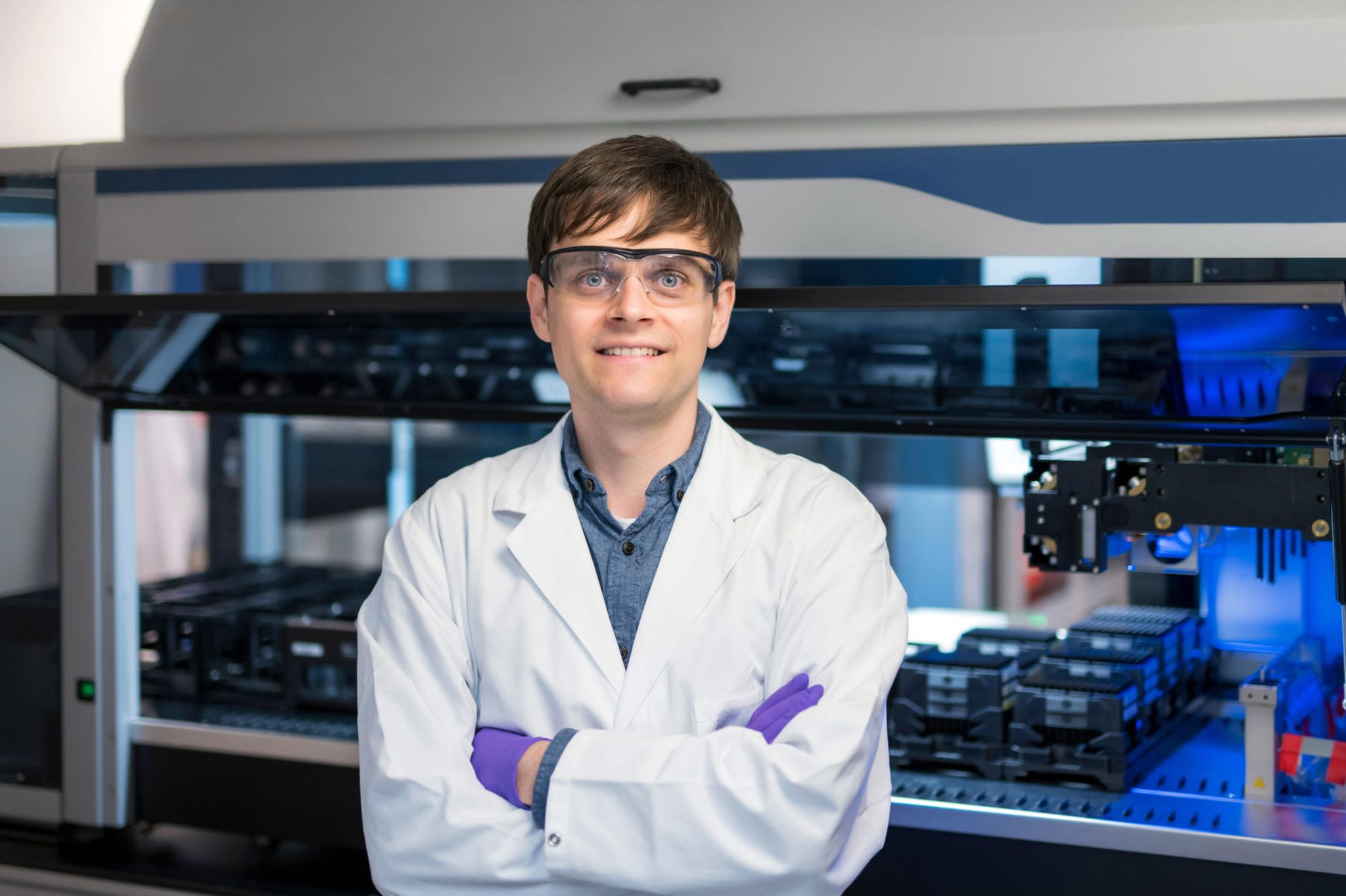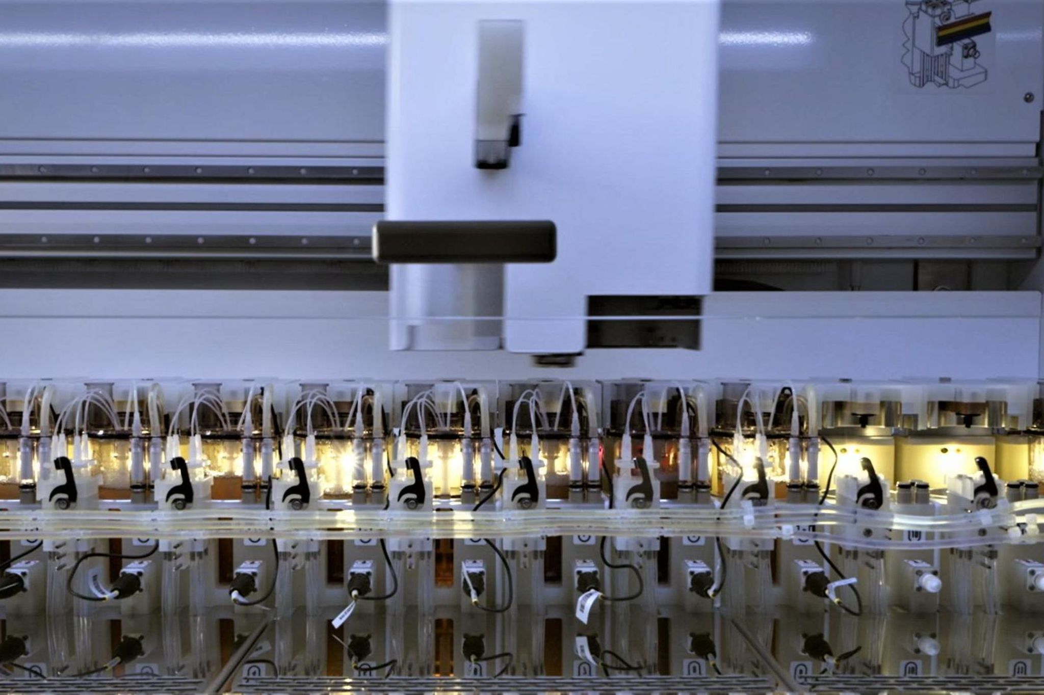Doch um die beiden herum erinnert nur wenig an ein Bilderbuchlabor. Die Forscher in der Large Molecule Forschung am Sanofi-Standort in Frankfurt-Höchst pipettieren nur noch selten Flüssigkeiten zwischen Kolben und Reagenzgläsern. Stattdessen hieven Maschinen hier Paletten mit hunderten teelöffelgroßen Wirkstoffproben von einem Versuch zum nächsten. Die Testergebnisse liefern die Geräte direkt an die Computer im Labor.