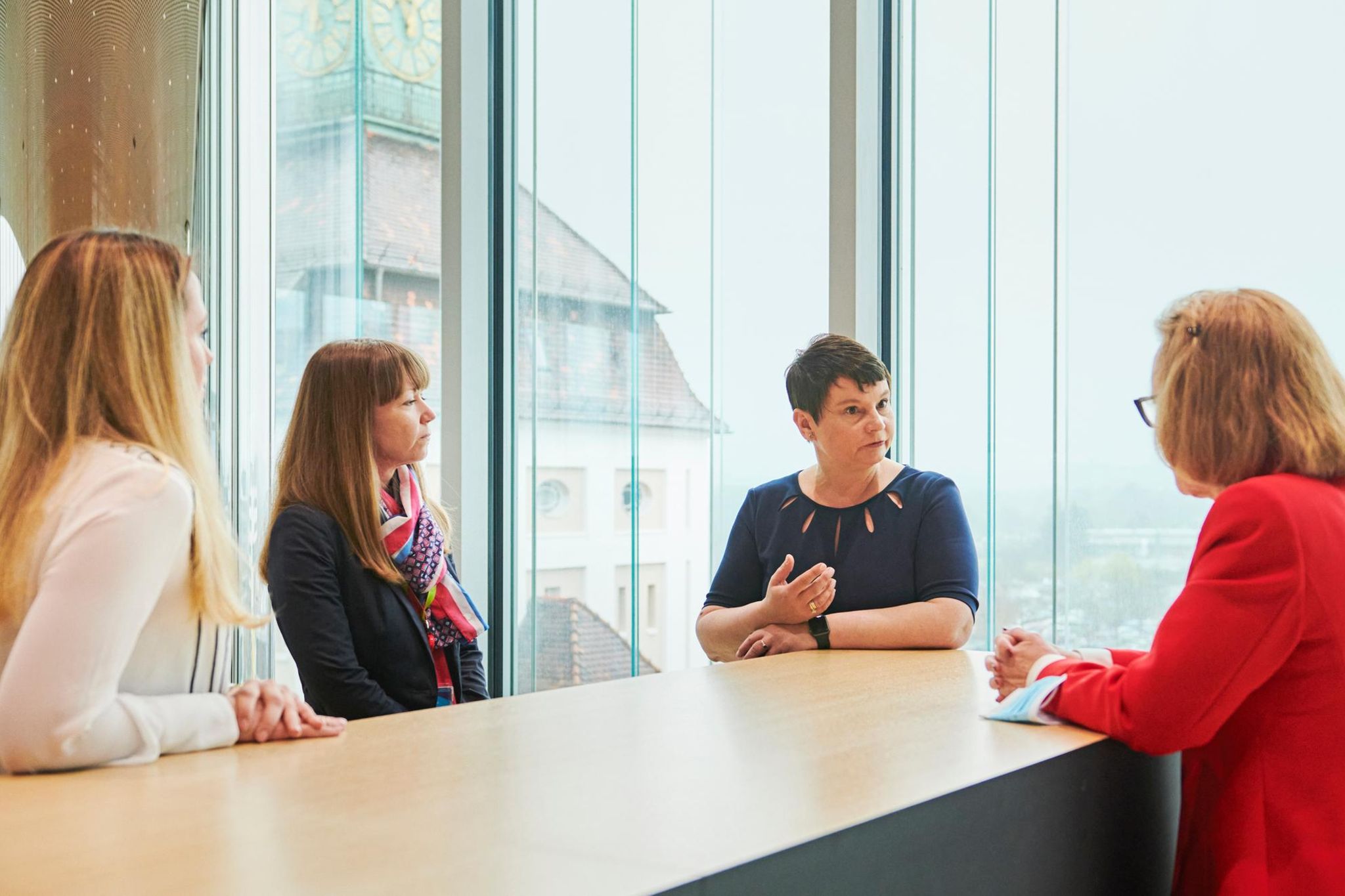 11.15 Uhr: „How are your families?“, fragt Garijo die Ukrainerinnen, die schon länger bei Merck in Darmstadt sind. Alle drei sorgen sich um ihre Verwandten, sie hören Bombeneinschläge, wenn sie telefonieren. Das Team hat eine Spendenaktion unter den Mitarbeitern organisiert. Merck hat 3 Mio. Euro gestiftet.