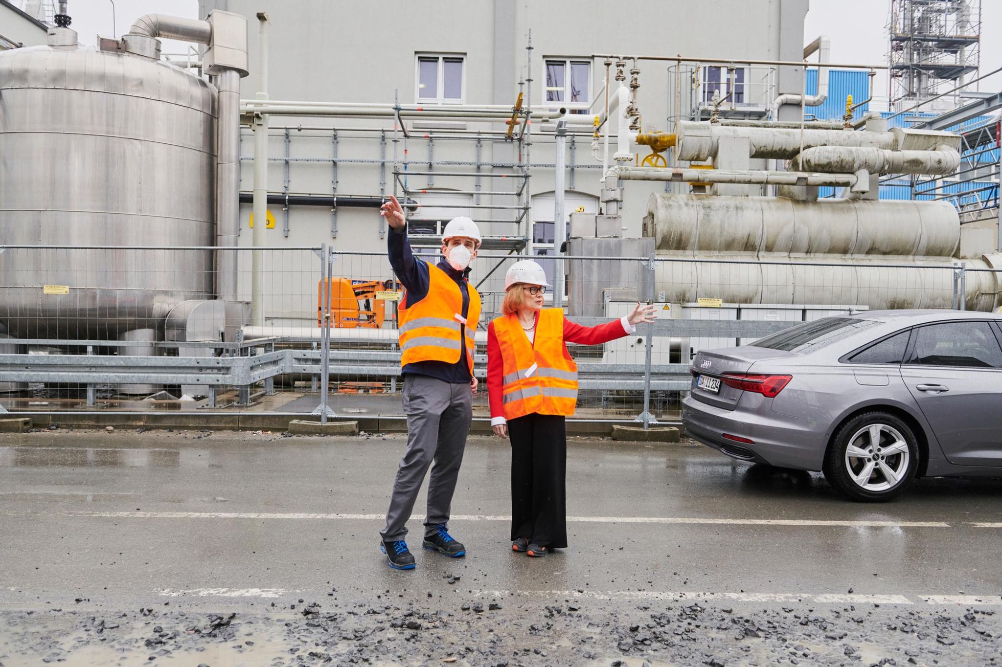 11.40 Uhr: Baustellenbesuch auf dem Werkgelände. Sicherheitsschuhe sind Pflicht. Auch hier ist die Chefin wie aus dem Ei gepellt. Perlenkette, Kurzjackett und Pumps (jenseits der Baustelle) gehören zu ihren Markenzeichen. Als Typ wirkt sie reserviert – doch als Chefin sei sie Teamplayer, sagen ihre Mitarbeiterinnen.