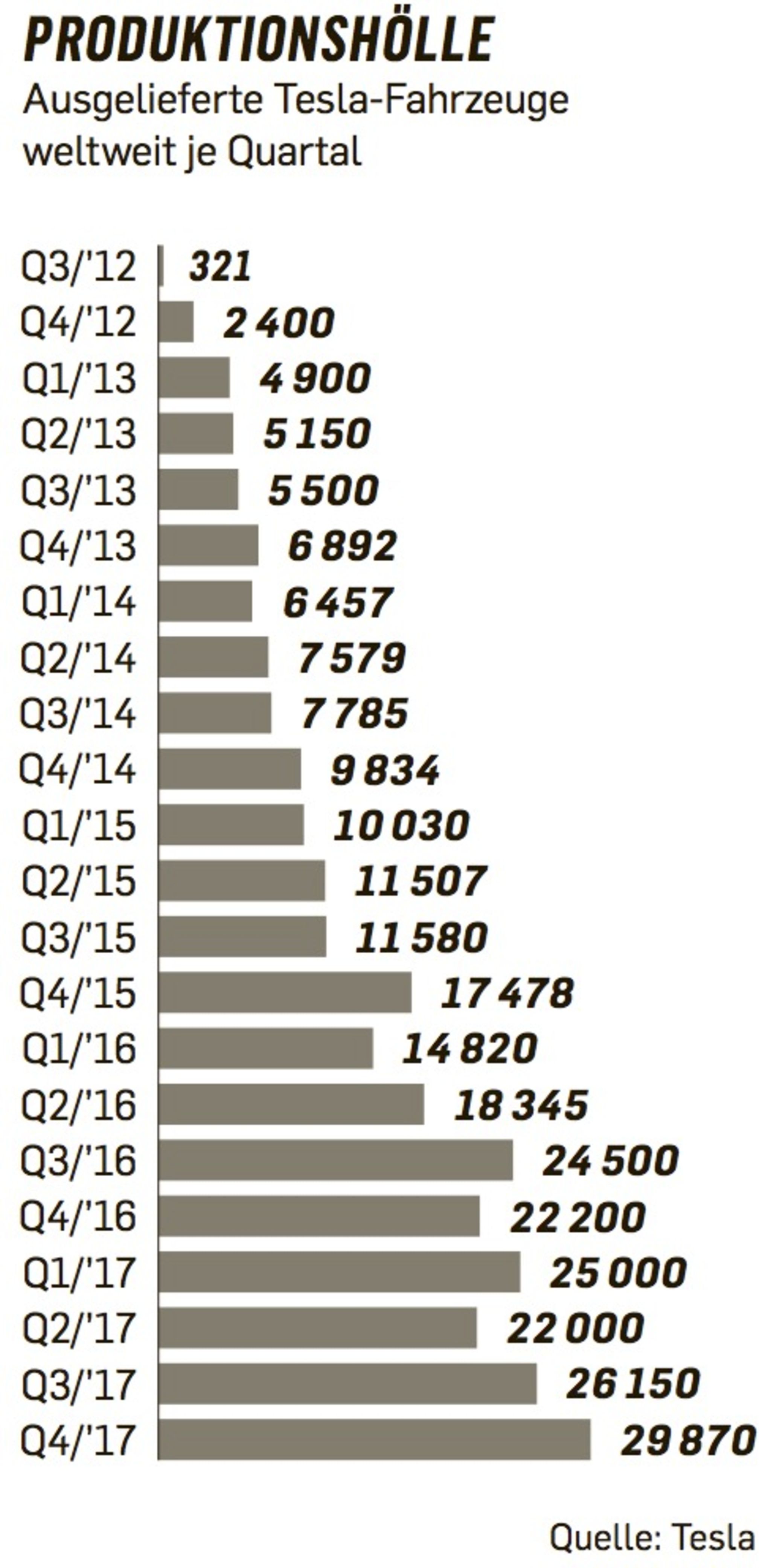 „Wir haben nie an Teslas Fähigkeit gezweifelt, aufregende Produkte mit Top-Features zu entwickeln“, sagt Morningstar-Analyst David Whiston. „Aber etwas anzukündigen und es dann auch perfekt in großer Masse herzustellen – das ist ein großer Unterschied.“ Das Problem: Besonders viele Model-3-Autos gibt es nach wie vor nicht. 100.000 bis 200.000 Fahrzeuge hatte Musk für die zweite Jahreshälfte 2017 angekündigt. Tatsächlich ausgeliefert wurden nur ein paar Tausend.