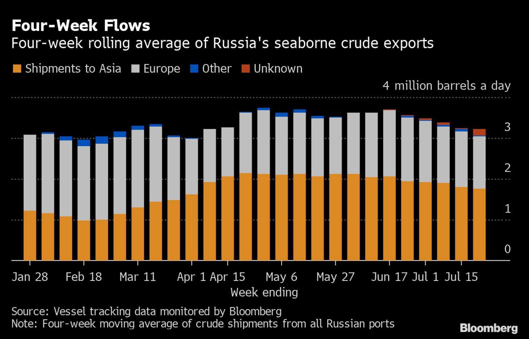 Ausgehend von den derzeitigen Bestimmungsorten war der durchschnittliche Durchsatz von russischem Rohöl nach Asien in den vier Wochen bis zum 22. Juli mit 1,75 Millionen Barrel pro Tag der niedrigste Wert seit 16 Wochen. Dies wird auch dann der Fall sein, wenn alle Rohöltanker, deren Bestimmungsort noch nicht feststeht, in den kommenden Wochen asiatische Häfen anlaufen.
