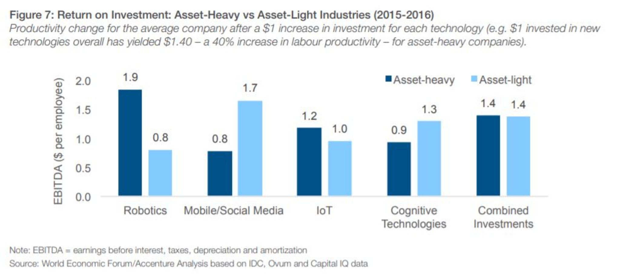 Um Rendite und Produktivität zu steigern, werden Unternehmen von 2016 bis 2020 jährlich rund 13 Prozent mehr in neue Technologien investieren, schätzt die vom WEF 2015 gestartete Digital Transformation Initiative (DTI). Von den rund 2,4 Mrd. Dollar, die dann 2020 investiert werden, fließen 42 Prozent in das Internet der Dinge. Investitionen in Social Media fallen dagegen zurück: Sie werden relativ stabil bleiben und in drei Jahren noch ein Viertel ausmachen.